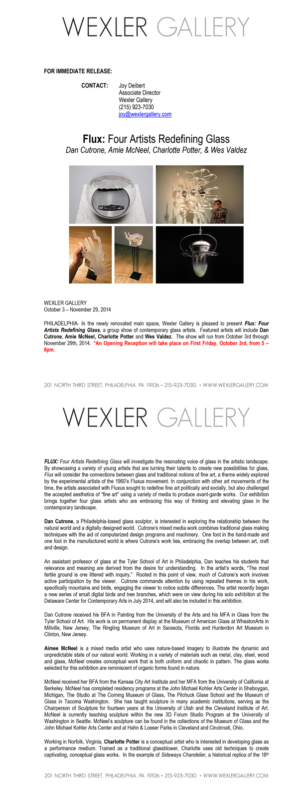 As the 50th anniversary celebration of Studio Glass wound down in 2012, a sense of restlessness came over the glass art world struggling to define itself going forward. Several prominent university professor positions have been filled by a new generation of glass artists who approach the material with more of a conceptual strategy. A group of art school grads curated their own shows under the banner of Hyperopia Projects, with future plans for a possible publication and exhibitions defining a new terrain of glass art. In March 2015, The Corning Museum of Glass will unveil its new wing that joins contemporary artists fabricating work in glass with recent works by artists steeped in glass. And a Facebook group attempts to distinguish those glass artists "seceeding" from what its organizers consider outdated forms of glass art. While these nonprofit and institutional developments have helped to identify new directions in glass, this area has so far failed to find much of a market. But an upcoming Wexler Gallery exhibition with the ambitious title of "Flux: Four Artists Redefining Glass" may signal a new embrace of this work by a commercial gallery.