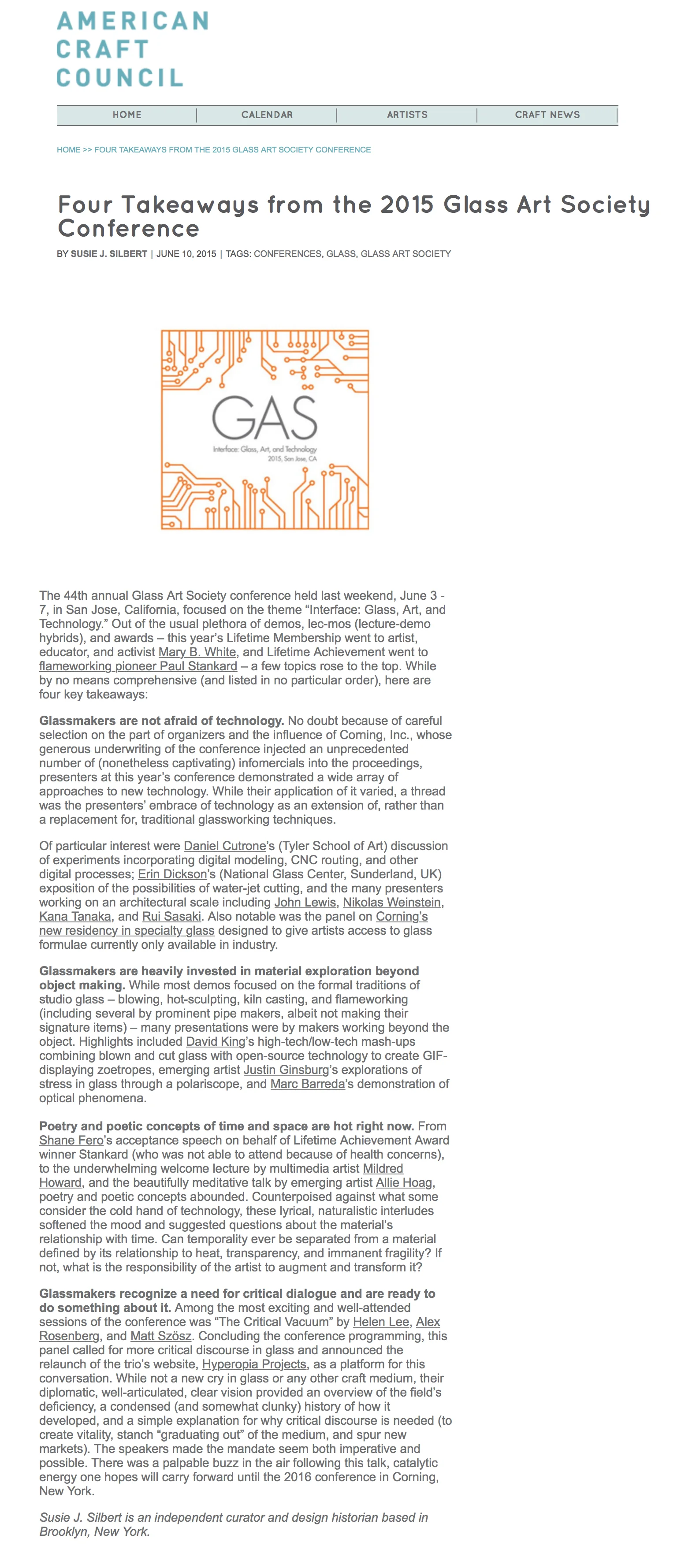 Charlotte Potter is a traditional glassblower who utilizes the art form as a means of performing pieces that delve into the philosophy of the human experience. She does this by incorporating her own physicality in each piece (a notion she spoke on in a previous interview with the GLASS Quarterly Hot Sheet). Potter's work has reached widespread audiences in such galleries as S 12 in Bergen Norway, The Oklahoma City Museum of Art, the Corning Museum of Glass, and the Toledo Museum of Art.